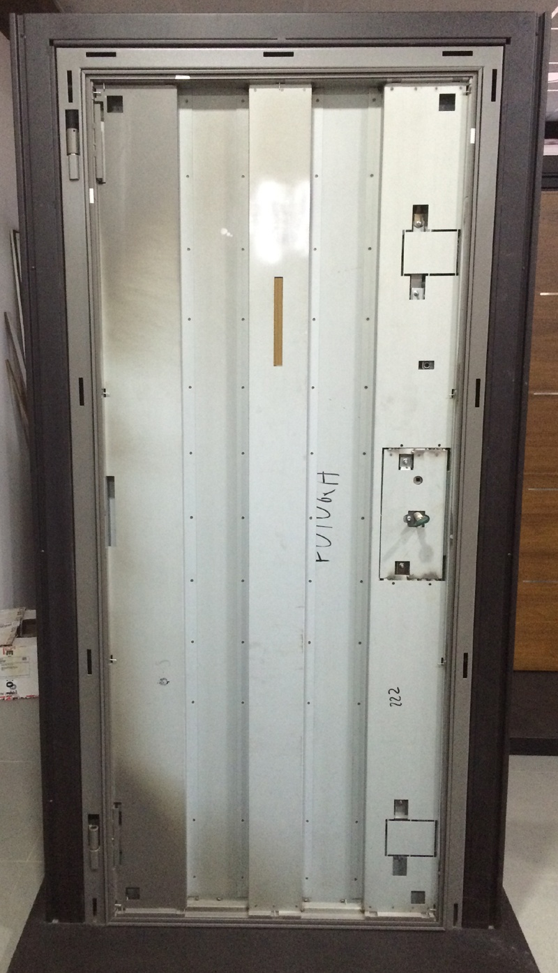 La instalación se compone de quitar puerta vieja eliminando marco de madera viejo y colocar pre-marco de acero nuevo de 2 mm. de espesor.